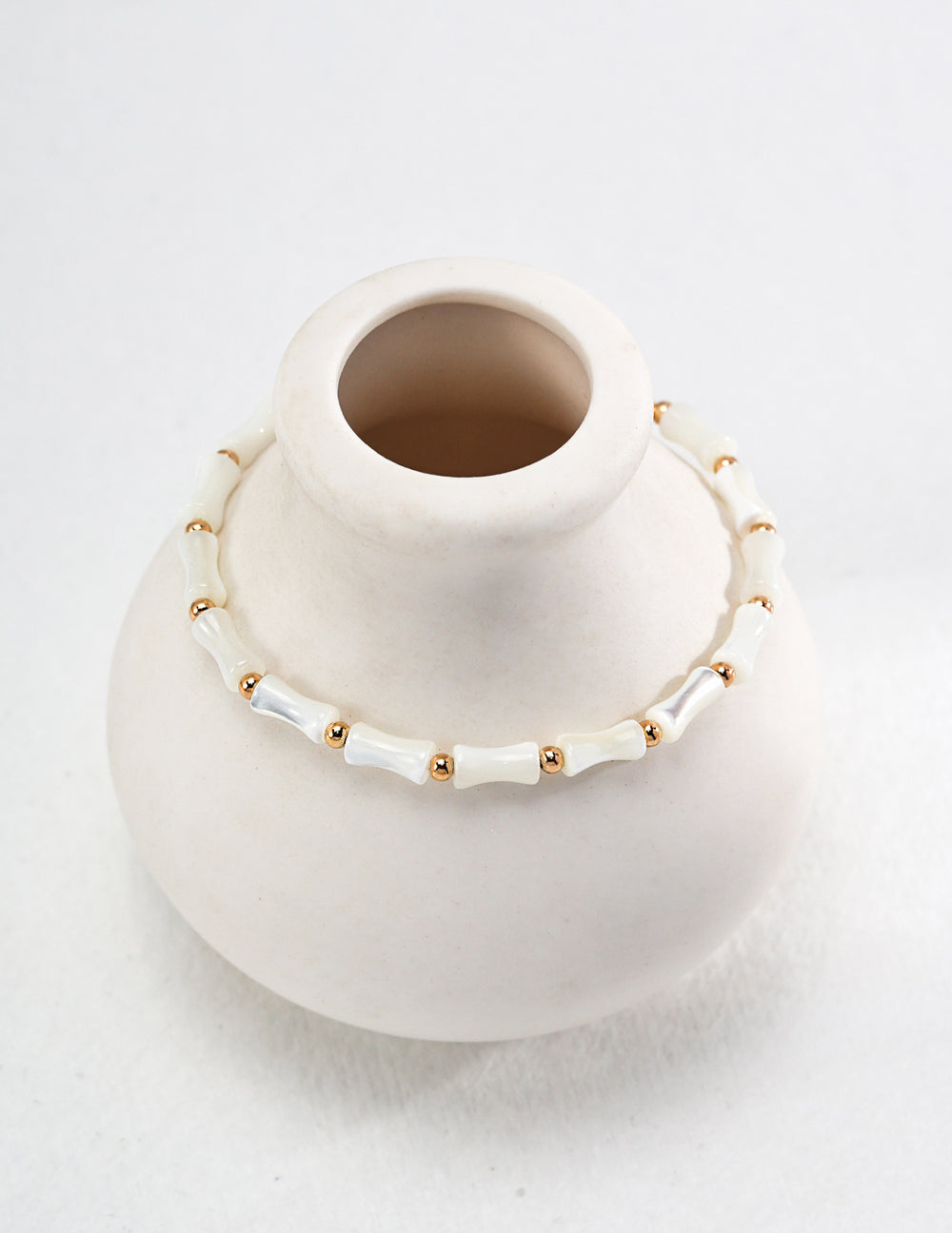Pearl white bamboo links, a golden chain, and all the charm you need for an instant mood lift.