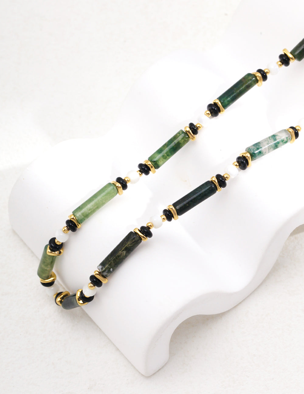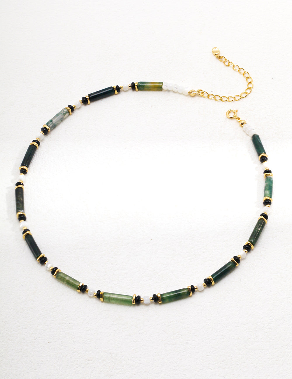 Crafted in S925 silver with a gold-tone chain, this piece blends shell, moss agate, and black onyx — each stone unique, each telling its own story.