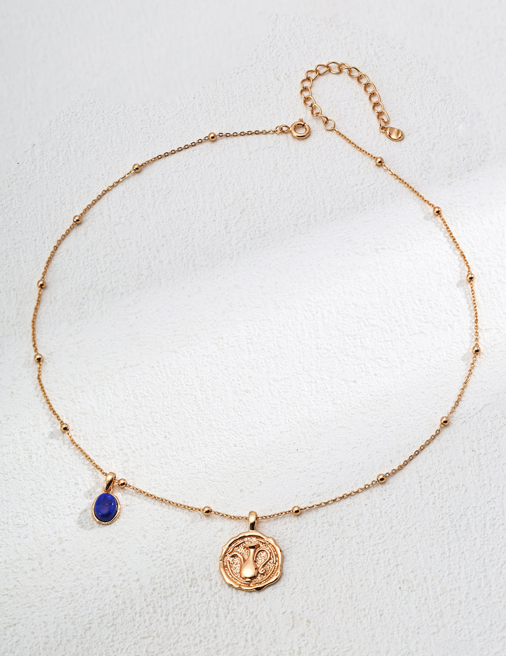 A deep-blue lapis lazuli pendant for calm strength, paired with a vintage gold tag engraved with a tiny wish pot — symbol of hope and quiet wishes.